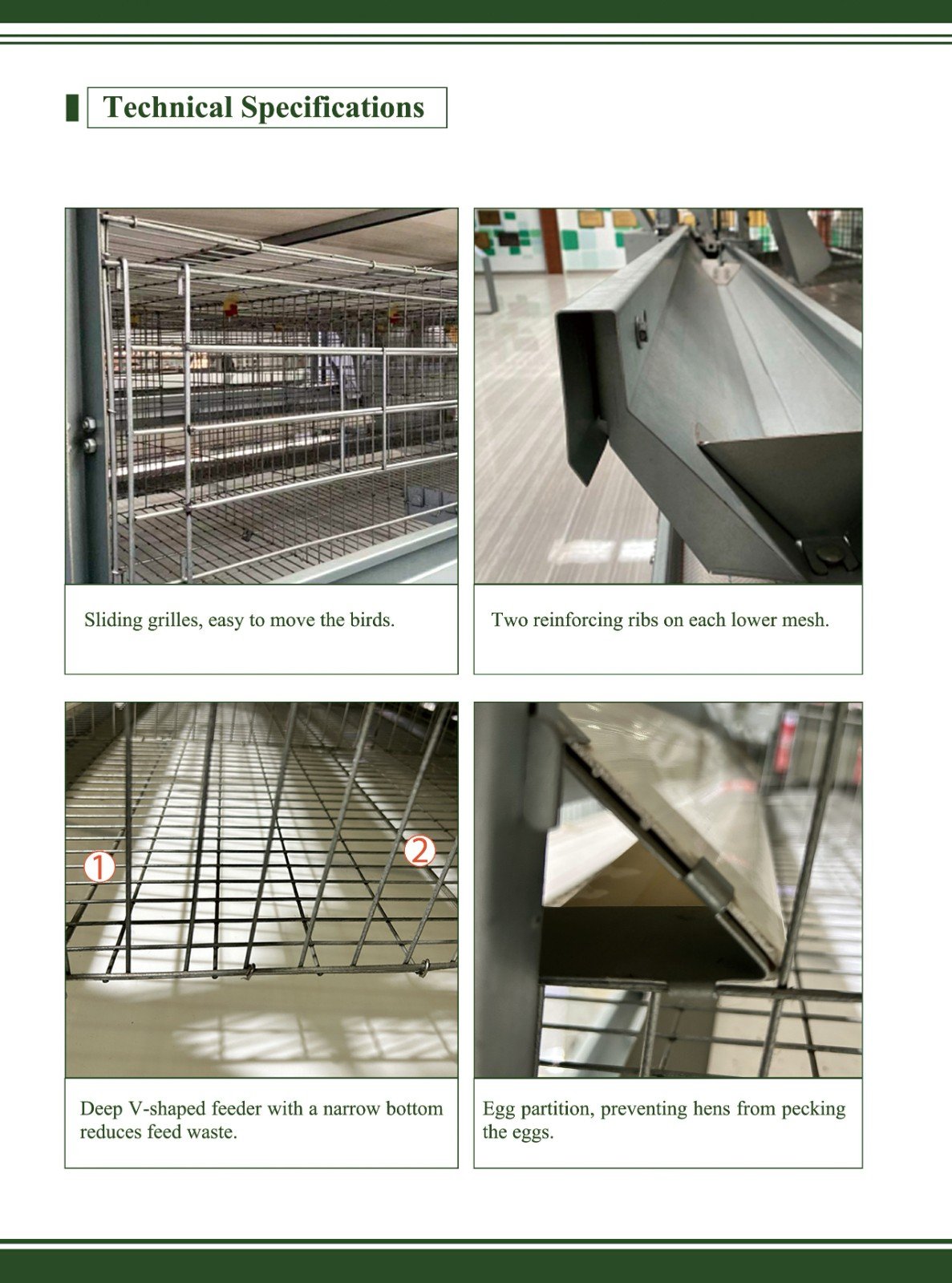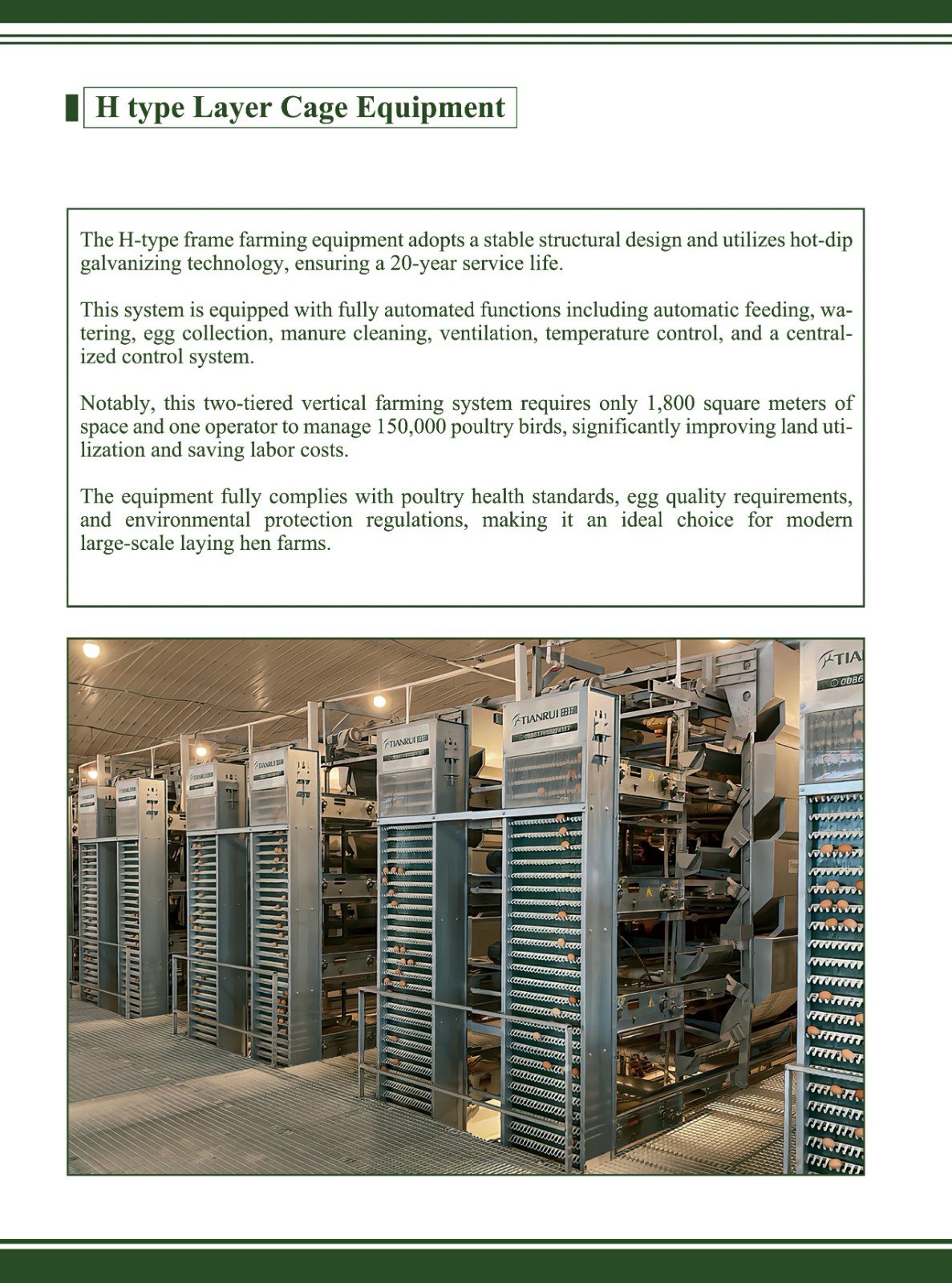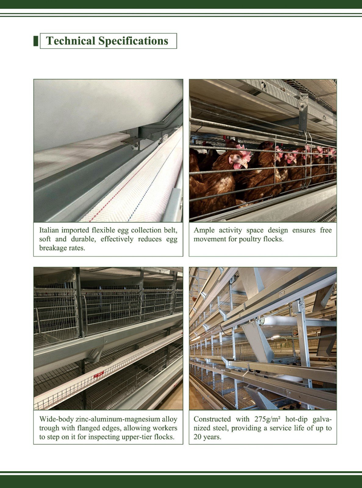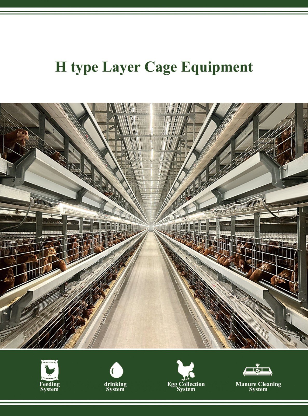 The H-type layer cage equipment: Unique H-shaped structure for efficient space utilization and enhanced cage density. Precise automated feeding, supplying nutrients per growth stage. Intelligent drinking water management with constant-pressure clean supply. Advanced manure removal system. Accurate environmental control for stable temperature, humidity, and adjusted lighting and ventilation. Convenient egg collection, reducing breakage and labor. High-quality, comfortable and spacious cages. Excellent epidemic prevention, with good enclosure, independent units, and easy-to-clean materials ensuring biological safety. Overall, it promotes efficient, high-quality and safe layer cage management.