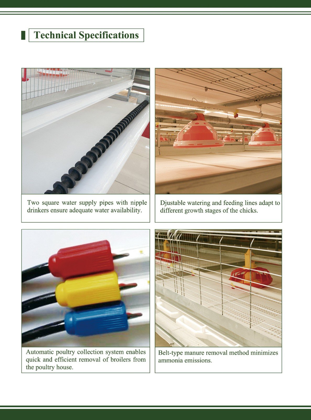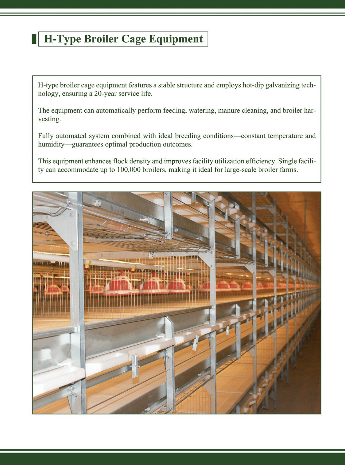 The H-type broiler equipment: H-shaped construction optimizing space. Automated feeding for accurate nutrition. Intelligent climate control for suitable temperature and humidity. Efficient ventilation to keep air fresh. Sturdy and comfortable housing promoting growth. Hygienic waste management system. Easy operation and maintenance. Overall, it effectively supports healthy and rapid broiler growth.